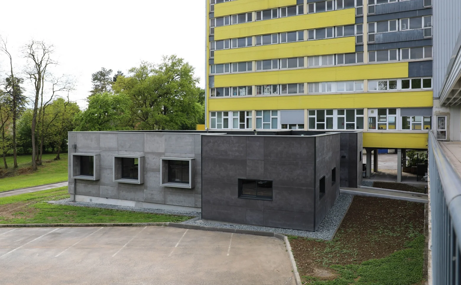 Réalisée par Pays de Montbéliard Agglomération (PMA), maître d’ouvrage de l’opération, cette extension de 249 m² s’inscrit dans la volonté de renforcer l’offre de formation professionnelle sur le territoire. Cinq modules ossature bois, préfabriqués par l’entreprise 3D BAT’ à Levier avec du bois local et un toit végétalisé, composent ce nouvel ensemble. Les modules sont conformes à la nouvelle norme environnementale RE 2020[1] et sont entièrement pré-équipés.
