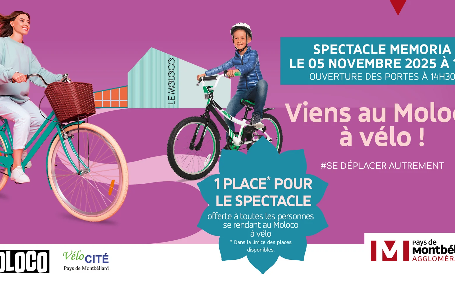 Dans ce cadre, PMA et le Moloco proposent une offre spéciale à l’occasion du spectacle jeune public « Mémoria » le mercredi 5 novembre : les spectateurs qui viendront à vélo se verront offrir une place par Le Moloco pour assister au spectacle (dans la limite des places disponibles).