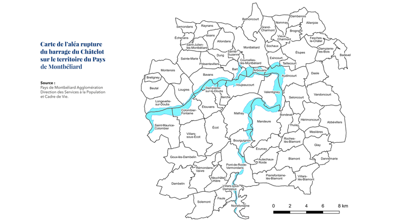 En cas de rupture, 22 communes seraient concernées par l’onde de submersion comprise entre 0 et 8 mètres de haut : Audincourt, Arbouans, Bart, Bavans, Berche, Bourguignon, Colombier-Fontaine, Courcelles-lès-Montbéliard, Dampierre-sur-le-Doubs, Etouvans, Exincourt, Lougres, Longevelle-sur-le-Doubs, Mandeure, Mathay, Noirefontaine, Pont-de-Roide, Saint-Maurice-Colombier, Taillecourt, Valentigney, Villars-sur-Dampjoux et Voujeaucourt.