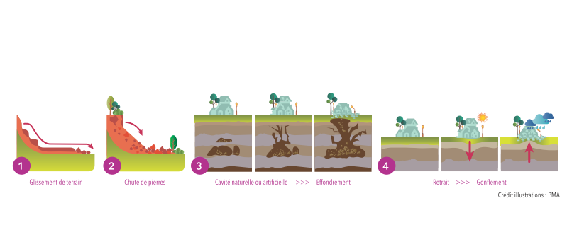Les mouvements de terrain regroupent un ensemble de déplacements, plus ou moins brutaux, du sol ou du sous-sol. Plusieurs catégories existent dont quatre sont susceptibles de se produire sur le territoire de l’agglomération :