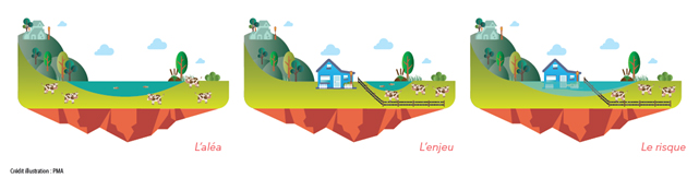 Exemple : une inondation (Aléa) pouvant affecter un quartier (Enjeu).