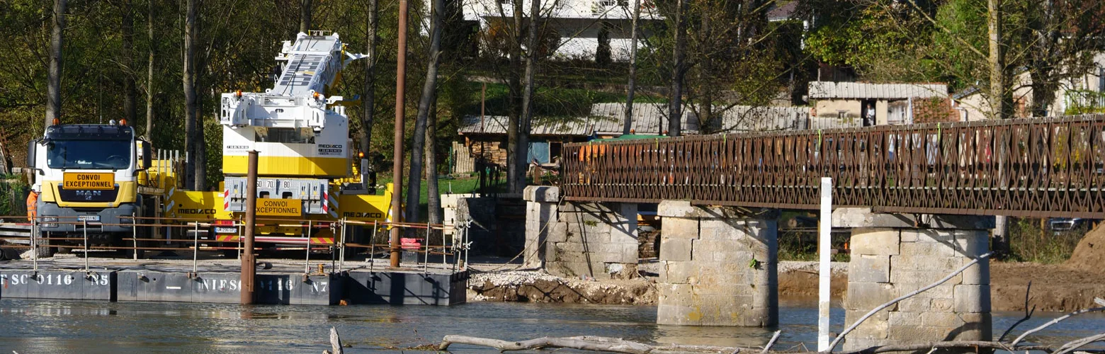 - Réfection des piles en milieu aquatique, avec pour missions principales : réalisation d’un ponton flottant, mise en place de palplanches autour des piles, reconstruction des piles avec micropieux, réalisation des nouveaux appuis, mise en place des 10 passerelles par grutage, et vérinées sur leurs appuis.